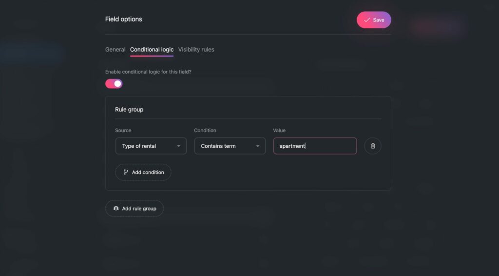 To activate conditional logic for a specific field, click on the field. In the field popup, go to the “Conditional logic” tab and turn on the option “Enable conditional logic for this field?”