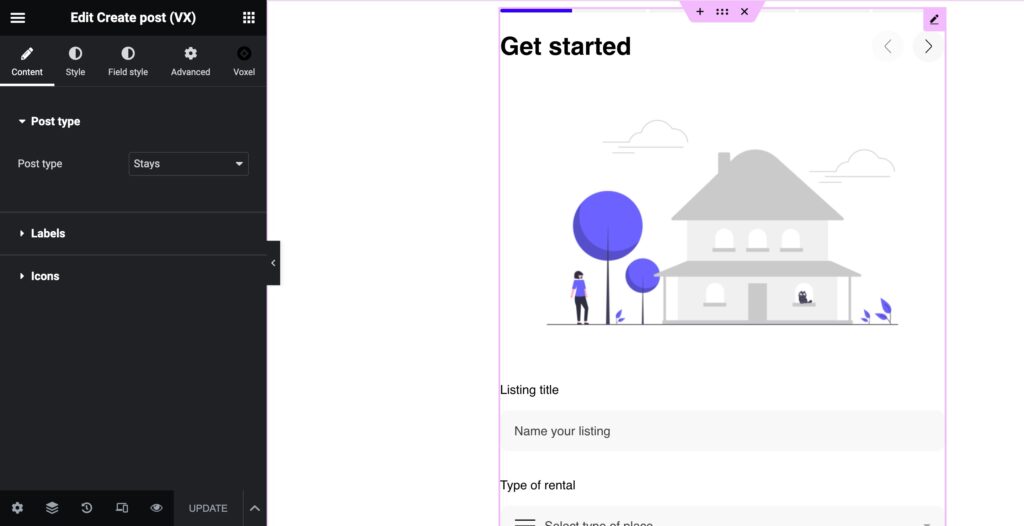 The Create post (VX) displays the front-end submission form for a post type.