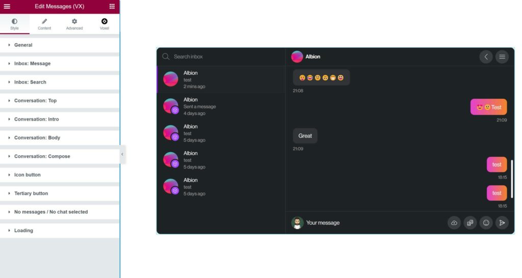 The Inbox (VX) widget enables the Direct messages functionality in Voxel.