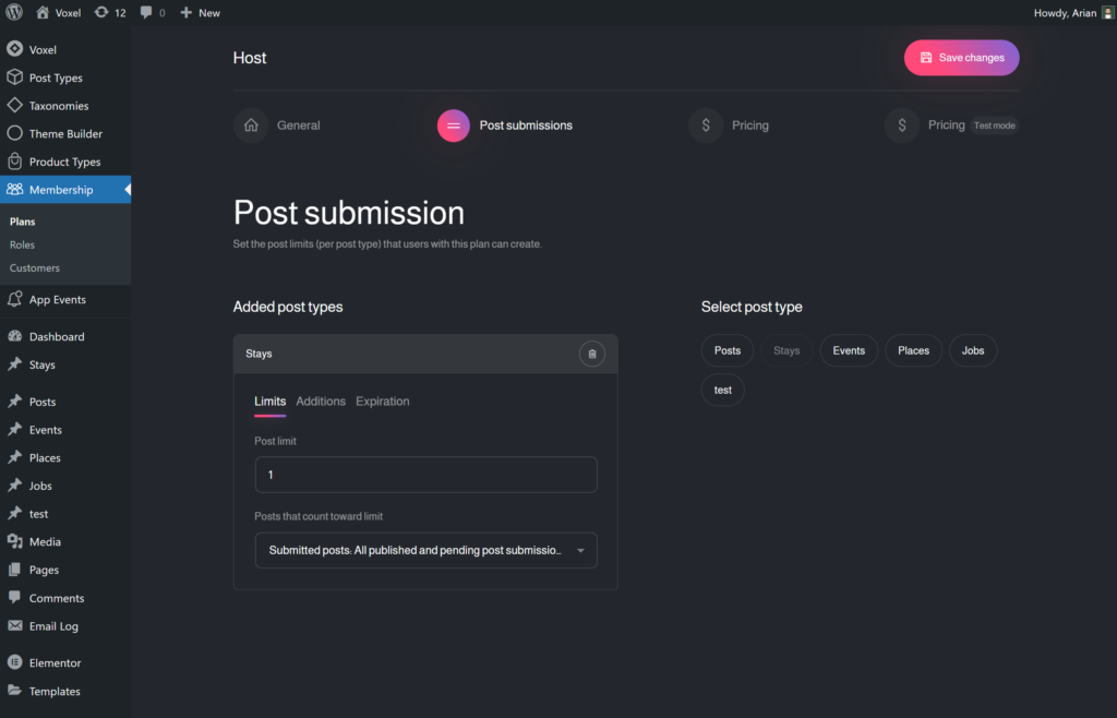 In the Post submissions tab, you can setup the post submission settings for users with this membership plan.