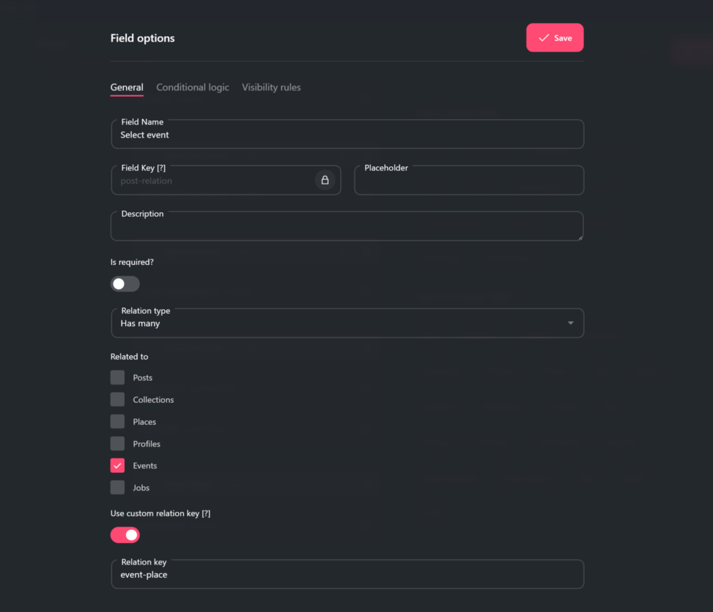 So far, we can pick an Event during Place submission. If we want to also add the ability to pick a Place during Event submission, we can edit the Event post type and add a Post relation field on that post type aswell. (This is optional, not required for the relationship to work)