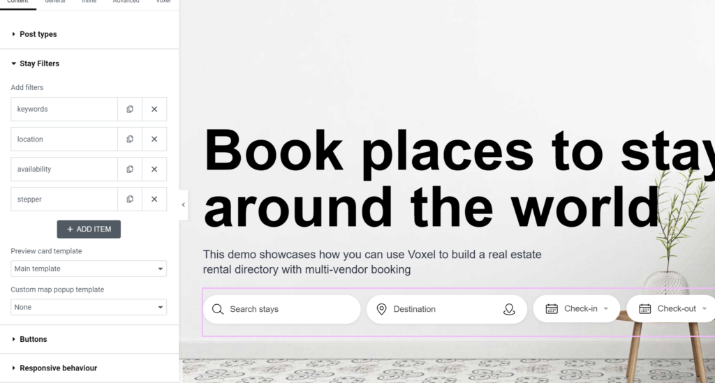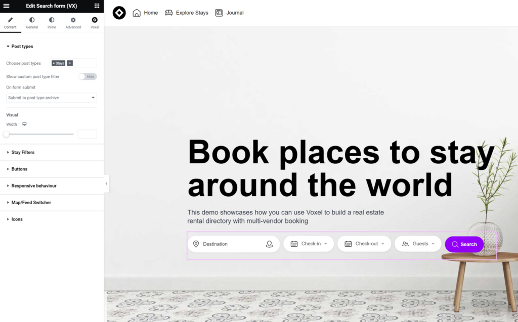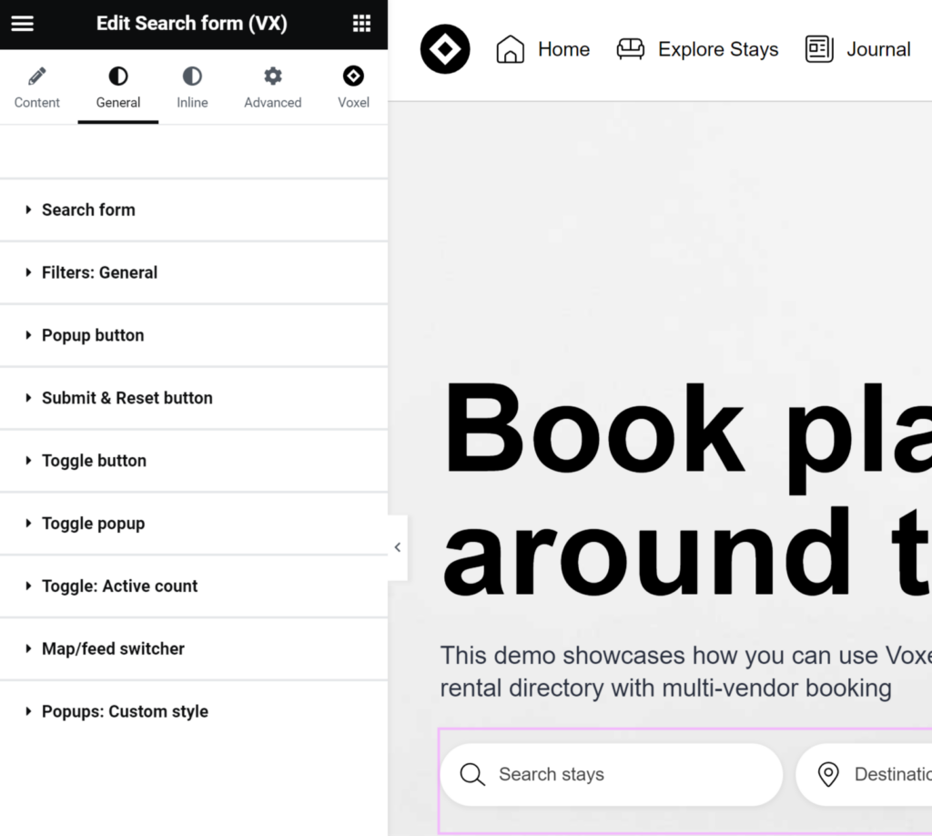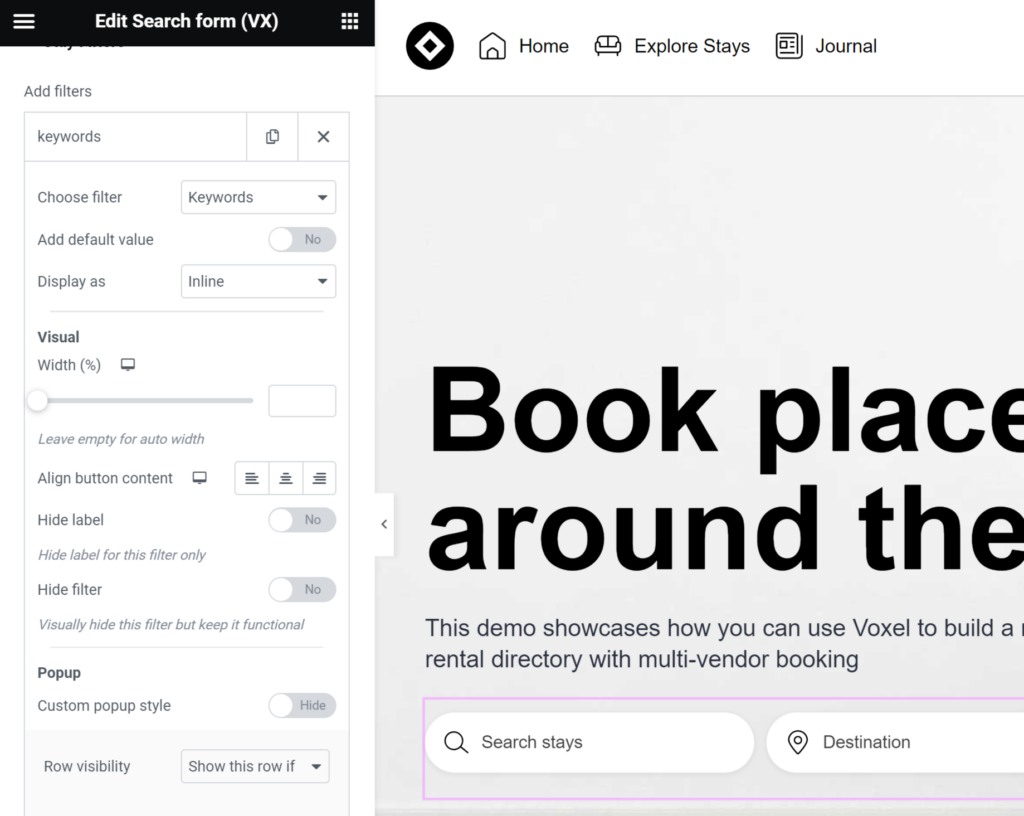 The Search form (VX) widget is used to create and design search forms for your post types. It utilizes filters that are created in the post type editor